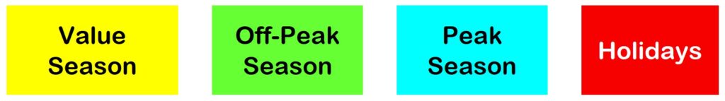 - 2-night minimum stay during Peak and Off-Peak Seasons. (1-night stay - If available add $10.00 to rates)